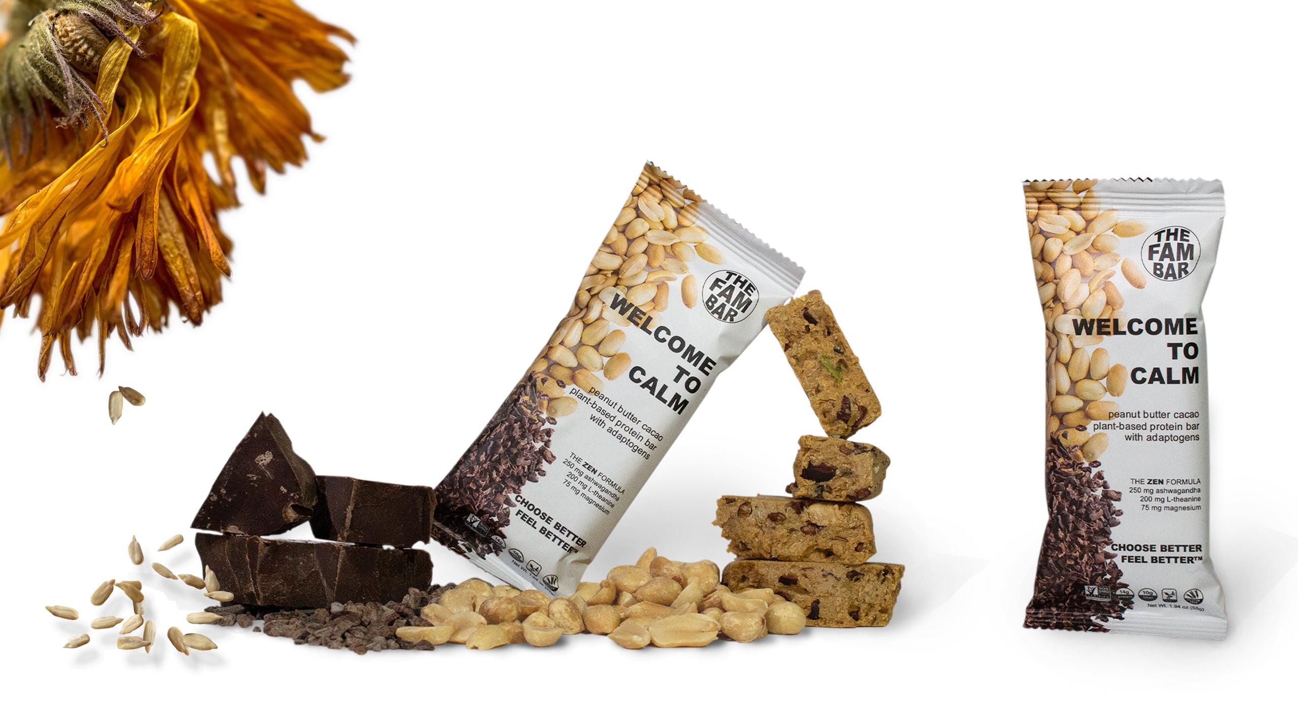That's why we created our flagship Peanut Butter Cacao bar with adaptogens to provide real functional support for stress and anxiety. It's not just a snack--it's your new daily ritual to help you feel calmer, clearer and more balanced.